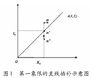 逐點(diǎn)比較法在實(shí)現(xiàn)直線插補(bǔ)時(shí), 需要先確定起點(diǎn)和終點(diǎn),根據(jù)起點(diǎn)和終點(diǎn)的相對(duì)位置來(lái)判斷象限, 并據(jù)此來(lái)判斷進(jìn)給方向。假設(shè)點(diǎn)在第一象限, 第一象限內(nèi)的直線插補(bǔ)如圖1 所示。