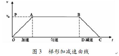 直線加減速控制又稱梯形速度曲線控制, 它使機(jī)床啟動(dòng)時(shí), 速度按照一定斜率的直線上升, 在停止時(shí), 速度沿一定斜率的直線下降。如圖3 所示。