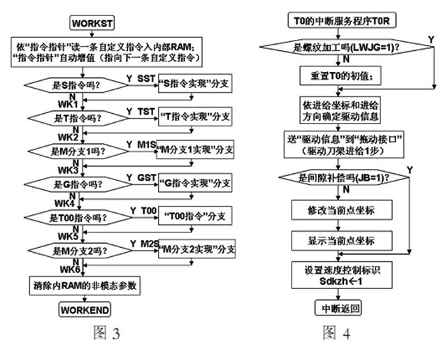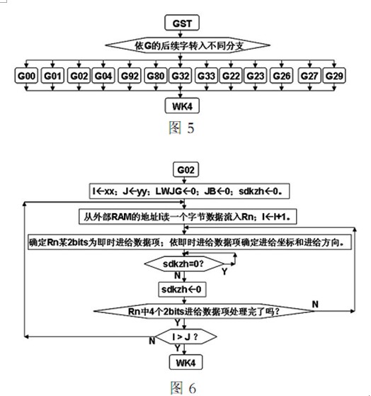 圖 6 為圖 5 的 G02 分支框圖 圖中的標識 sdkzh 由圖 4 置位sdkzh 為 1 表示刀架已進給一步(10-2mm) 圖 4 為定時器 0 中斷服務程序 它控制加工速度 刀架進給和即時坐標顯示
