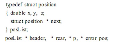 此模塊主要用來(lái)實(shí)現(xiàn) NC文件的數(shù)據(jù)讀入。 數(shù)控加工刀軌仿真的關(guān)鍵就是從 NC文件中讀取三軸聯(lián)動(dòng)加工信息。這些加工信息主要包括 G功能代碼和尺寸字。本文根據(jù)三軸聯(lián)動(dòng)的實(shí)際特性 ,只對(duì)以下三組常用代碼作相應(yīng)的處理: G00~G O2; G17~G19; G90, G91。系統(tǒng)在讀入 NC文件之后 ,需將NC文件數(shù)據(jù)轉(zhuǎn)化為仿真所需的坐標(biāo)點(diǎn) ,并存儲(chǔ)到鏈表中[ 1 ]。鏈表結(jié)構(gòu)如下: