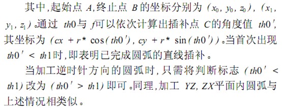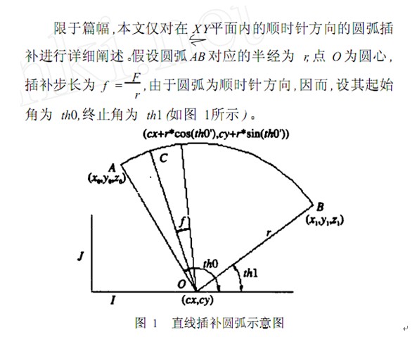 根據(jù)坐標(biāo)值前的 G代碼不同作出相應(yīng)的處理:若為直線(xiàn)加工指令 (GO1) ,直接將端點(diǎn)坐標(biāo)值添加到鏈表當(dāng)中;若為圓弧加工指令 (GO2, GO3) ,則以進(jìn)給量當(dāng) (即插補(bǔ)步長(zhǎng) ) f為步長(zhǎng),用直線(xiàn)插補(bǔ)來(lái)近似圓弧,并將所有直線(xiàn)段的端點(diǎn)坐標(biāo)值添加到鏈表當(dāng)中。