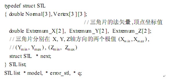 在 ST L文件中所有三角面片被無(wú)序列出 ,相互之間不存在任何拓?fù)湫畔?/span> , 這將導(dǎo)致刀位點(diǎn)到模型的最短距離計(jì)算過(guò)程相當(dāng)困難。 因此 ,重建零件 ST L模型的拓?fù)湫畔⑹欠浅1匾摹?/span> 在讀入零件的 ST L模型數(shù)據(jù)時(shí),依據(jù)三角面片的 Z方向的極大值進(jìn)行排序,從大到小依次保存到鏈表當(dāng)中。 同時(shí),為了簡(jiǎn)化后續(xù)數(shù)據(jù)計(jì)算過(guò)程,在鏈表中設(shè)計(jì)了兩個(gè)數(shù)組用來(lái)保存三角面片在 XY投影面上的四個(gè)極值。 鏈表結(jié)構(gòu)定義如下: