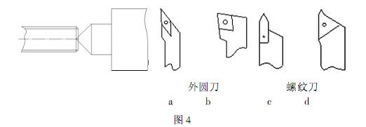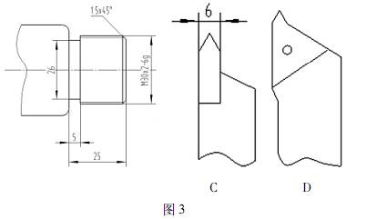 如圖3 用 C 這樣的一把螺紋刀進(jìn)行切削加工,在編寫(xiě)程序時(shí) G92X29. 1 Z - 23 F2 中的 Z - 23 是沒(méi)有考慮到所使用的刀具,Z 值應(yīng)該小于且減去螺紋刀尖寬度的一半,z 值小于25 - 3 即小于22,在實(shí)際編寫(xiě)中考慮 Z 向?qū)Φ墩`差等因素,這個(gè)程序應(yīng)改為 G92 X29. 1 Z -21. 5 F2 ,就可以加工了 如果用的是 D 這樣螺紋刀具在,z 值可以用原來(lái)的程序進(jìn)行加工