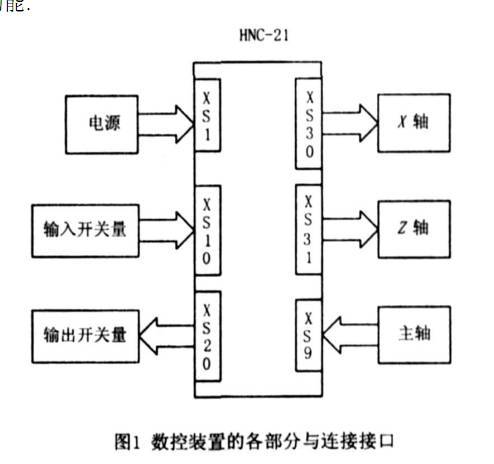 華中數控裝置作為 C6140普通車床數控改造的控制核心 , 通過D型連接器分別與電源、顯示器、主軸和進給驅動裝置等電氣設備聯接 , 協調各部分完成數控加工. 改造過程中原有的電氣控制電路也進行了相應的數控改造 , 改造后的機床不僅具有控制、數顯及報警功能 , 還具有監視機床各電氣結構工作狀態的功能. 華中數控裝置 HNC - 21TF與主要電氣部件的聯接見圖 1 , 其中: XS1為數控裝置電源連接口 , 電源為直流24 V; XS30和 XS31為模擬脈沖接口 , 在本方案中作為 X 軸、Z 軸指令脈沖接口; XS9 為主軸控制接口; XS10和 XS20分別為輸入、輸出開關量接口.