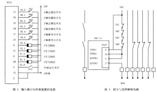 超程與急停免除是數控機床進行數控加工呈現意外毛病時所采納的保護措施. 這次改造中對上述毛病的掃除辦法規劃為: 數控機床立即中止運動或切除動力設備電源 ,并向數控體系供給毛病信號 , 經數控設備處置顯現報警信號. 圖 4 為超程與急停免除硬件電路銜接圖 , 圖中串聯聯接的 SQ1 (SQ3)和 SQ2(SQ4)