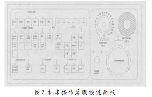 綜合實驗裝置由兩部分組成:一部分是數(shù)控系統(tǒng)控制部分;另一部分是伺服放大和電機等強電執(zhí)行部分。在控制部分,主要安裝有FANUC控制器、CRT/MDI、外置I/O模塊、機床操作面板、模擬操作和顯示平臺等。設(shè)計的機床操作面板如圖2所示。在執(zhí)行部分,主要安裝兩軸伺服放大、主軸變頻器、主軸位置編碼器、伺服電機和主電機、刀架電機以及機床電器等,除機床的機械部分外,數(shù)控機床電氣都清楚安裝在實驗臺上,加上器件透明安裝,容易理解數(shù)控機床電氣組成。