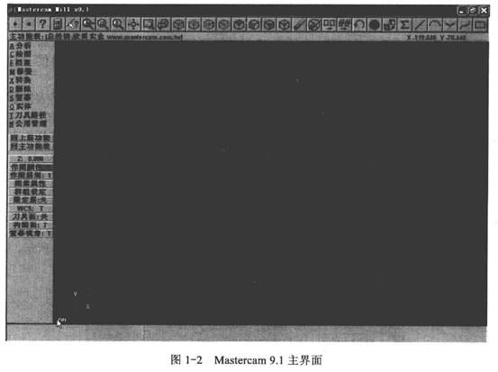 雙擊電腦桌面的 圖標(biāo),啟動(dòng)Mastercam Mill 9.1,屏幕分為五個(gè)區(qū):窗口左上方為主菜單區(qū)、左下方為副菜單區(qū)、中間黑色部分為繪圖區(qū)、上方為快捷命令圖標(biāo)區(qū)、下方灰色部分為系統(tǒng)提示區(qū),如圖1-2所示。此外,屏幕右上角顯示的(X} Y)坐標(biāo)值表示了鼠標(biāo)在移動(dòng)時(shí)的位置,屏幕繪圖區(qū)左下角的坐標(biāo)軸表示了系統(tǒng)當(dāng)前的視角設(shè)置狀態(tài),而mm或inch表示系統(tǒng)當(dāng)前設(shè)置的繪圖單位。