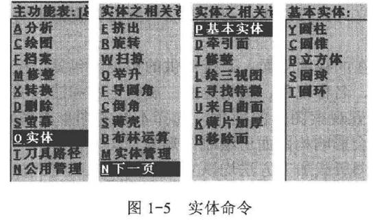 主菜單中的實(shí)體(Solid )命令,包括生成基本實(shí)體,擠出、旋轉(zhuǎn)、掃掠、舉升實(shí)體,對(duì)實(shí)體進(jìn)行倒圓角、倒角、薄殼、布爾運(yùn)算、管理和修改等,如圖1-5所示。