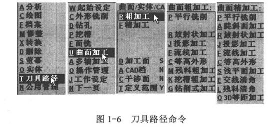刀具路徑(Toolpaths)包括外形銑削、鉆孔、挖槽、面銑、曲面加工、多軸加工等加工操作,以及操作管理、工作設(shè)定等。曲面加工包括平行銑削、放射狀加工、投影加工、流線加工、等高外形、殘料粗加工、挖槽粗加工、鉆削式加工等8種粗加工方式,以及平行銑削、陡斜面加工、放射狀加工、投影加工、流線加工、等高外形、淺平面加工、交線清角、殘料清角、3D等距加工等10種精加工方式,如圖1-6所示。