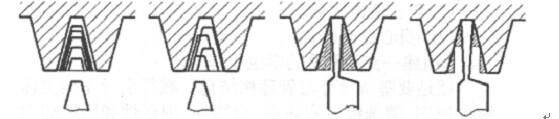 圖 1梯形螺紋車削的四種進刀方法在這四種切削方法中,除直進法外,其他三種車削方法都能不同程度地減輕或避免三刃同時切削,使排屑較順暢,刀尖受力、 受熱情況有所改善,從而不易出現振動和扎刀現象,還可提高切削用量,改善螺紋表面質量。所以,左右切削法、 車直槽法和車階梯槽法獲得了廣泛的應用。