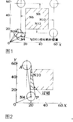 原因是當從N4段進入刀補啟動階段后,只能讀入N6、N8兩段,但由于Z軸是非刀補平面而且讀不到N10以后的段,也就作不出矢量,確定不了進刀的方向。此時盡管用G41進入了刀補狀態(tài),但刀具中心卻并未加上刀補,而直接移動到了點P1,當P1執(zhí)行完N6、N8段后,再執(zhí)行N10段,刀具中心從P1移動到交點A,此時就產(chǎn)生了圖2所示的進刀超程(過切)工件被切掉一塊。