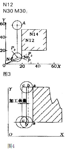 方法三:利用刀補指令使粗、精加工程序簡化。如圖4所示,可有意識地改變刀具半徑補償量,因為刀具半徑補償指令是按照刀庫表中的刀具半徑值而確定補償量的大小的,而不管實際用的刀具的半徑值的大小。那么,在應(yīng)用時則可用同一把刀具、同一條程序、不同的切削余量完成加工。從圖4可以看出,當設(shè)定補償量為a c時,刀具中心按cc運動,第二次設(shè)定補償量為ab時刀具中心按bb運動完成切削。這樣就可以通過改變刀庫表的刀具半徑的參數(shù),來完成多次切削而不用重新編寫程序。對加工不同材料的工件可以用同一條程序選用不同的加工余量進行精加工。其編程方法和以上相同。